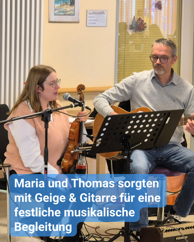Am 1. Advent, dem Tag, an dem Christen sich besonders an die erwartete Ankunft Jesu erinnern, fand in unserer Einrichtung eine stimmungsvolle Adventsfeier statt, zu der sowohl Bewohner als auch ihre Angehörigen herzlich eingeladen waren. In liebevoll geschmückter Atmosphäre genossen alle Beteiligten einen besinnlichen Nachmittag, der ganz im Zeichen der Vorweihnachtszeit stand.Für die musikalische Umrahmung sorgten Maria und Thomas, die mit warmen, weihnachtlichen Klängen auf Geige und Gitarre für eine festliche Stimmung sorgten. Ihre Musik erfüllte den Raum und brachte viele Augen zum Strahlen. Bei selbstgebackenen Plätzchen, duftendem Kaffee und traditionellem Christstollen kamen Bewohner und Angehörige miteinander ins Gespräch und genossen das gemütliche Beisammensein. Es wurde gelacht, erzählt und gemeinsam der Beginn der Adventszeit gefeiert.Die Feier war ein gelungenes Zusammenspiel aus Musik, Gemeinschaft und weihnachtlicher Vorfreude - ein Moment der Ruhe und des Miteinanders, der allen noch lange in schöner Erinnerung bleiben wird.