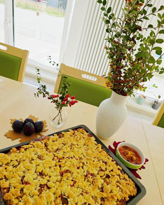 Der Herbst zeigt sich bei uns nicht nur draußen vor der Tür, sondern auch kulinarisch im Haus. Zum Wochenstart überraschte unsere Mitarbeiterin Grit Bewohnerinnen, Bewohner und Kolleginnen mit einem frisch gebackenen Pflaumenkuchen. Der warme Duft, der sich im ganzen Haus ausbreitete, sorgte sofort für eine gemütliche Stimmung und weckte die Vorfreude auf den gemeinsamen Kaffeegenuss am Nachmittag.