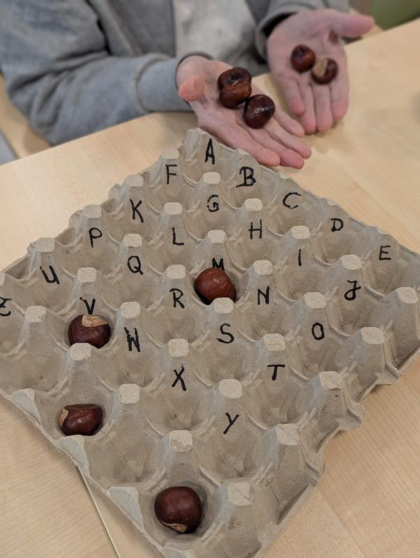 Pünktlich zum Herbstanfang wurden unserer Bewohner und Bewohnerinnen in einem herbstlichen Quiz gefördert und gefordert. Aus Eierpappen und Kastanien wurden kurzerhand wichtige Utensilien um zu bestimmten Buchstaben und Kategorien Begriffe, Gegenstände und Lebensmittel zum Thema Herbst zu sammeln.