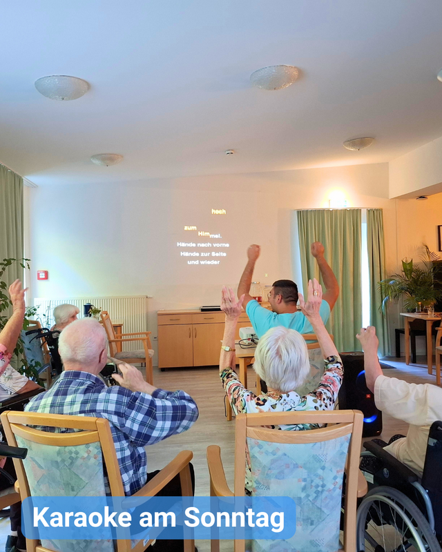 Einen riesen Gaudi machte uns, Bewohnern wie auch dem Personal, unser Karaoke-Singen am vergangenen Sonntag. So wurden sowohl altbekannte Lieder als auch moderne Schlager gedrellert. Zum Schluss gab es noch eine kleine Tanzeinlage, wo unser Tillmann auf Wunsch und mithilfe der Bewohner seinen Hüftschwung zu Elvis zeigen durfte. Leider verging die Zeit viel zu schnell und es besteht ein absoluter Wiederholungsbedarf.